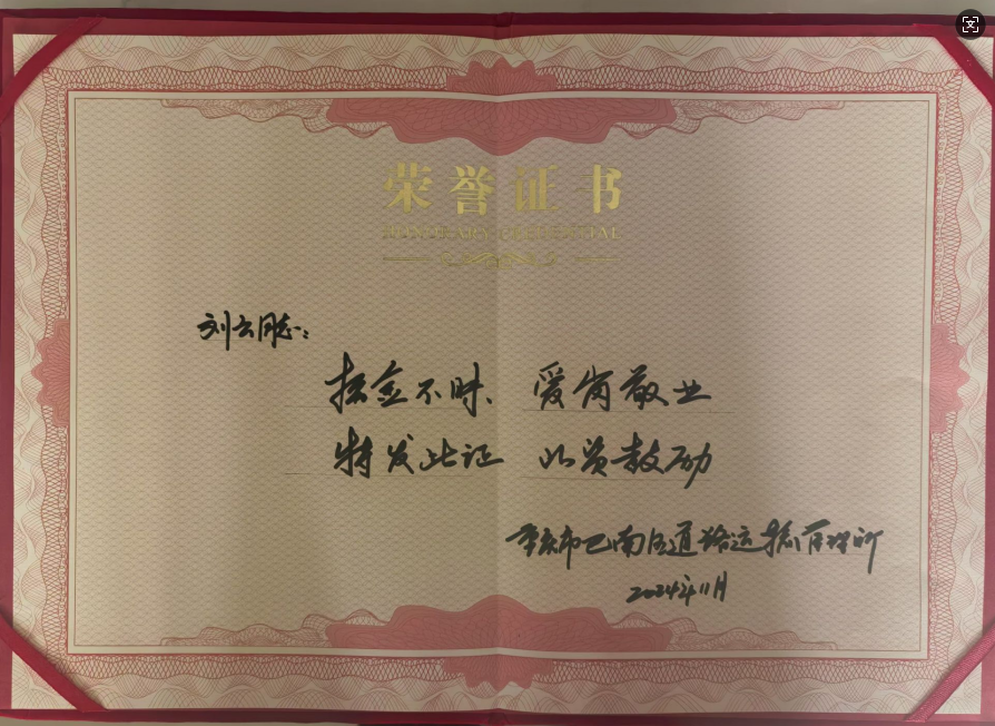 12月2日上午,巴南區(qū)運(yùn)管所所長(zhǎng)廖代鵬到接龍公交站為駕駛員劉云頒發(fā)榮譽(yù)證書(shū),表達(dá)對(duì)駕駛員劉云拾金不昧的高度贊揚(yáng)。