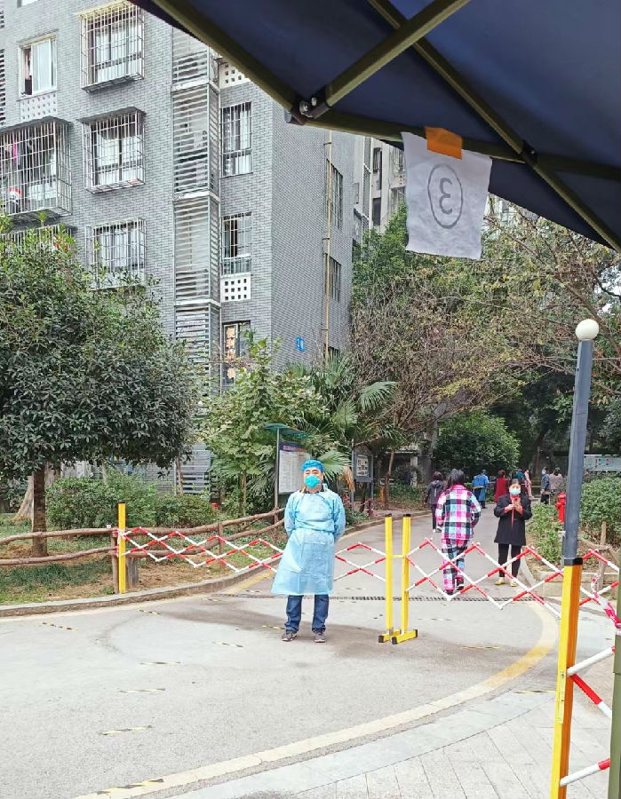 東城公交葉江同志配合社區(qū)參與維持秩序、物資配送工作。他說“我負(fù)責(zé)的這棟樓有陽性感染患者,被列為高風(fēng)險樓,志愿者少,社區(qū)安排我值守,維持秩序,不準(zhǔn)人員隨意進出。我是入黨積極分子,我義不容辭。我老婆也是黨員,已奮戰(zhàn)在一線十幾天沒有回家,作為入黨積極分子,我也不能扯她后腿。”