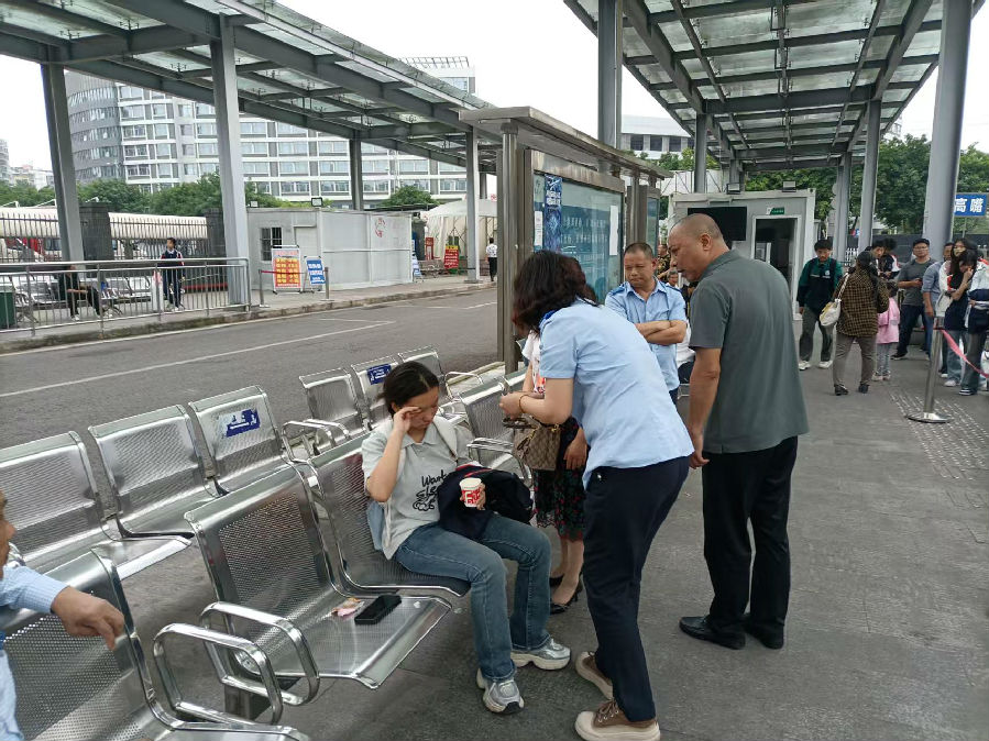 5月17日下午16:55分,雙鳳橋站務(wù)人員楊平發(fā)現(xiàn)候車椅上的一名學(xué)生臉色蒼白雙目緊閉,緩緩靠向椅邊,意識到情況異常立即前去詢問該學(xué)生的身體狀況,隨后兩位路隊長也趕到。因為不了解病因,只能通過捏手臂、掐人中等最簡單的急救方法,確保身體血液的循環(huán)、流通,并送上溫開水、糖、藿香正氣液等物品進行救助。不一會兒,這名學(xué)生慢慢恢復(fù)了意識。路隊一邊安撫情緒,一邊詢問其家長的聯(lián)系方式。當(dāng)學(xué)生母親趕到樞紐站時,看到安然無恙的小劉,她難掩激動,對兩位路隊長以及站務(wù)人員的熱心幫助表達了誠摯感謝。