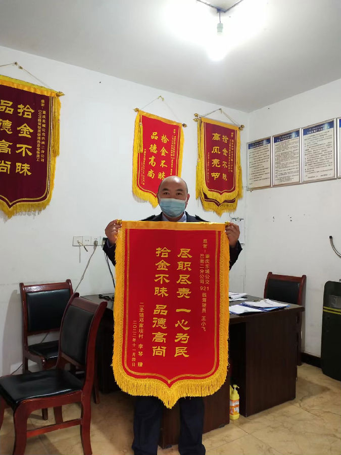 11月4日,木洞公交站場收到一面寫有“盡職盡責,一心為民,拾金不昧,品德高尚”的錦旗,感謝駕駛員王小飛拾金不昧的精神。
