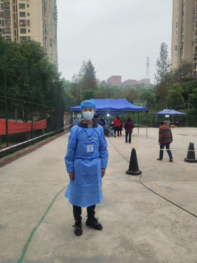 東城公交黨員何昌建負(fù)責(zé)提醒群眾檢測(cè)核酸,并幫助居民搬運(yùn)生活物資。黨員余春艷負(fù)責(zé)樓棟消毒。